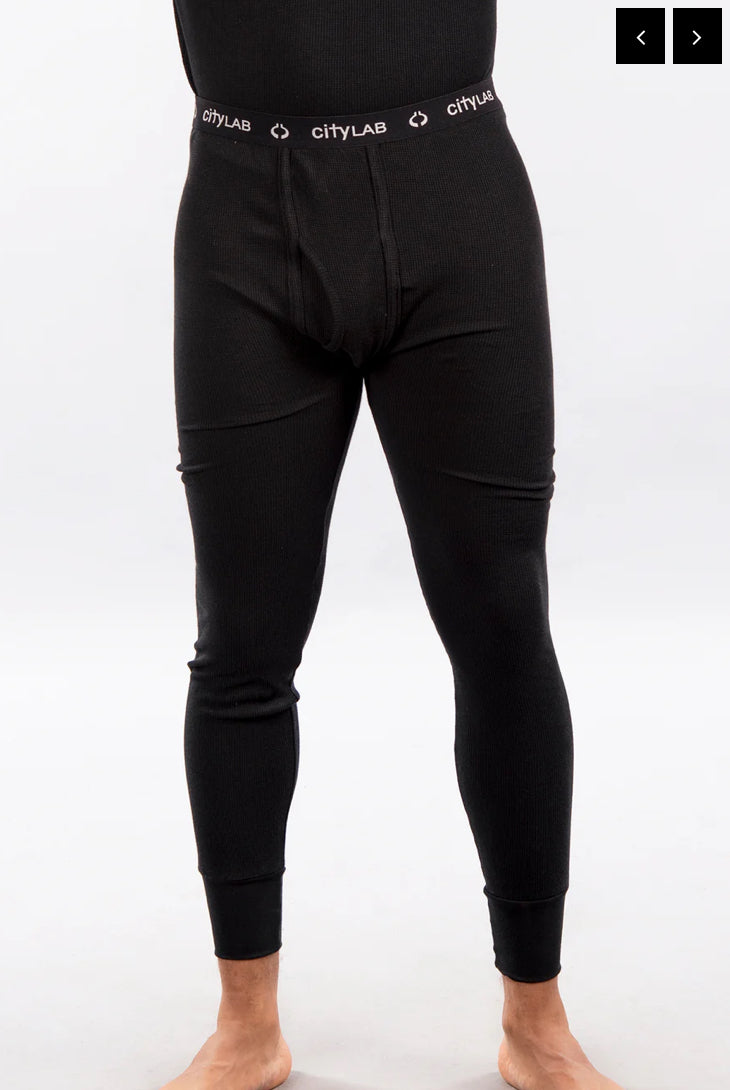 Warm and comfortable base layer thermal pants with soft cotton blend mini-waffle knit fabric.  Includes strong elastic waist band and 3" ribbed ankle cuffs for a secure fit.  Perfect for layering.