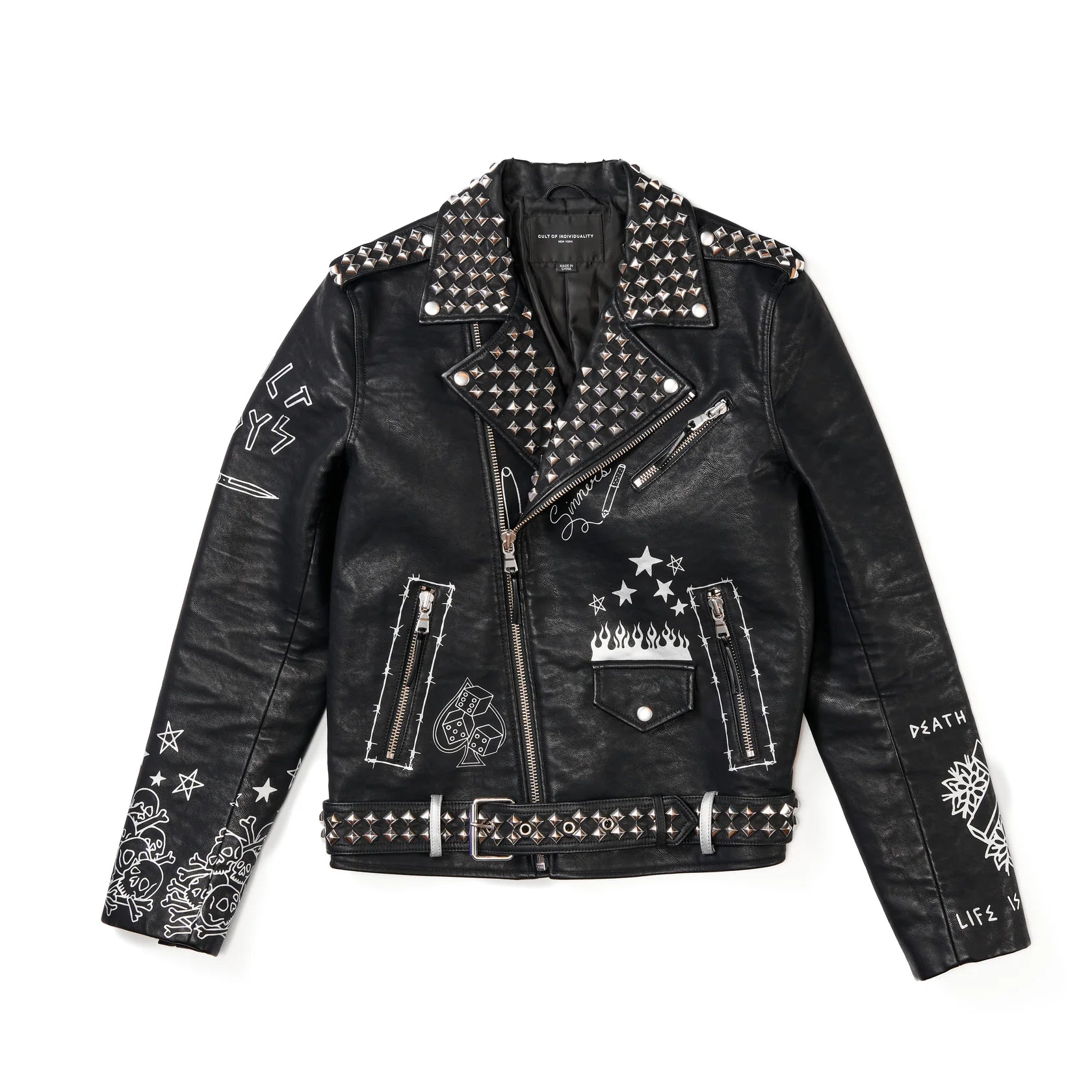 Our vegan leather motorcycle jacket is adorned with printed quotes and graphics throughout the jacket and an oversized print on the back, studs on the collar, shoulders, and belt, and zipper accents on the sleeves.