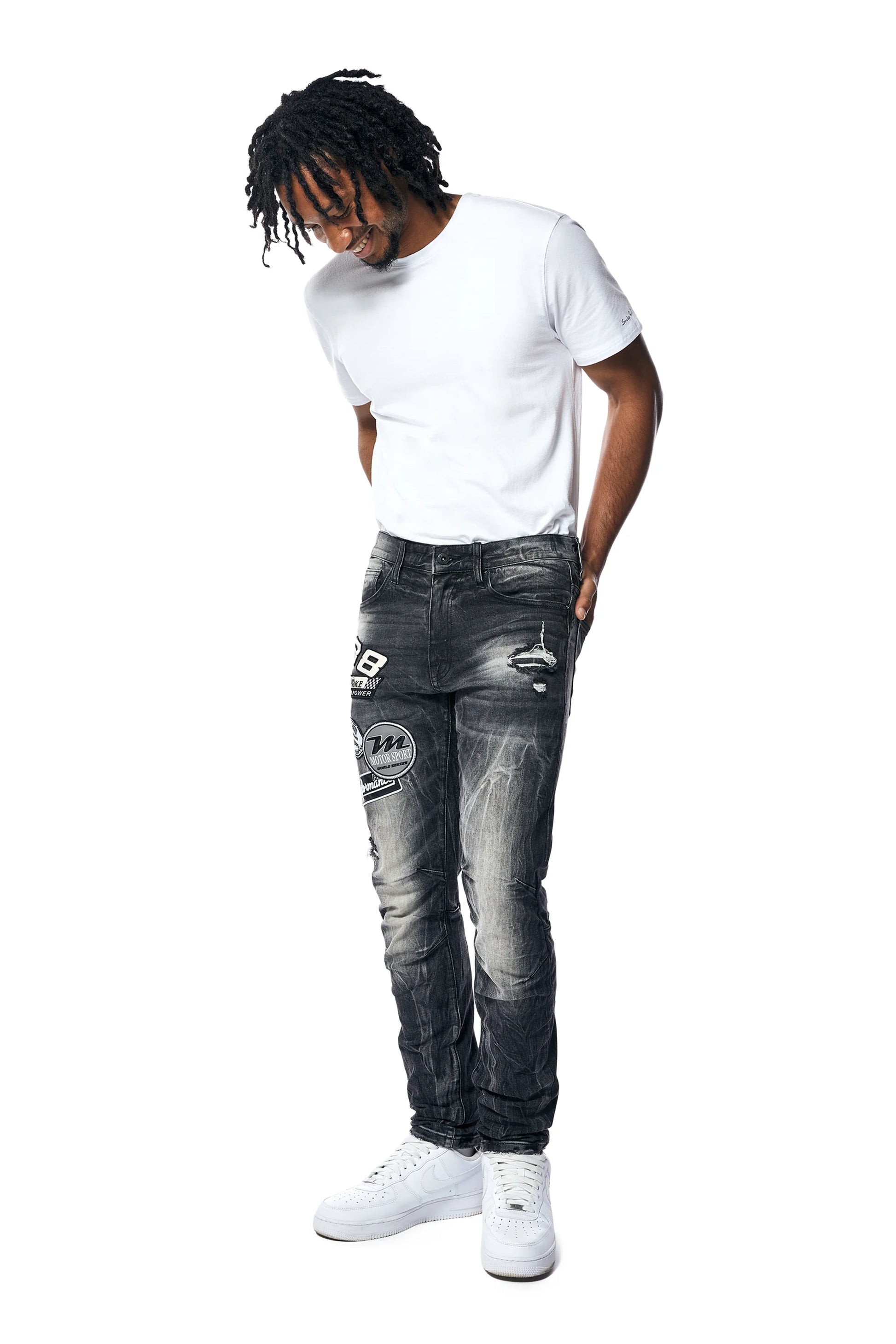 SMOKE RISE-Embroidered Patched Racing Denim Jeans - Moon Black