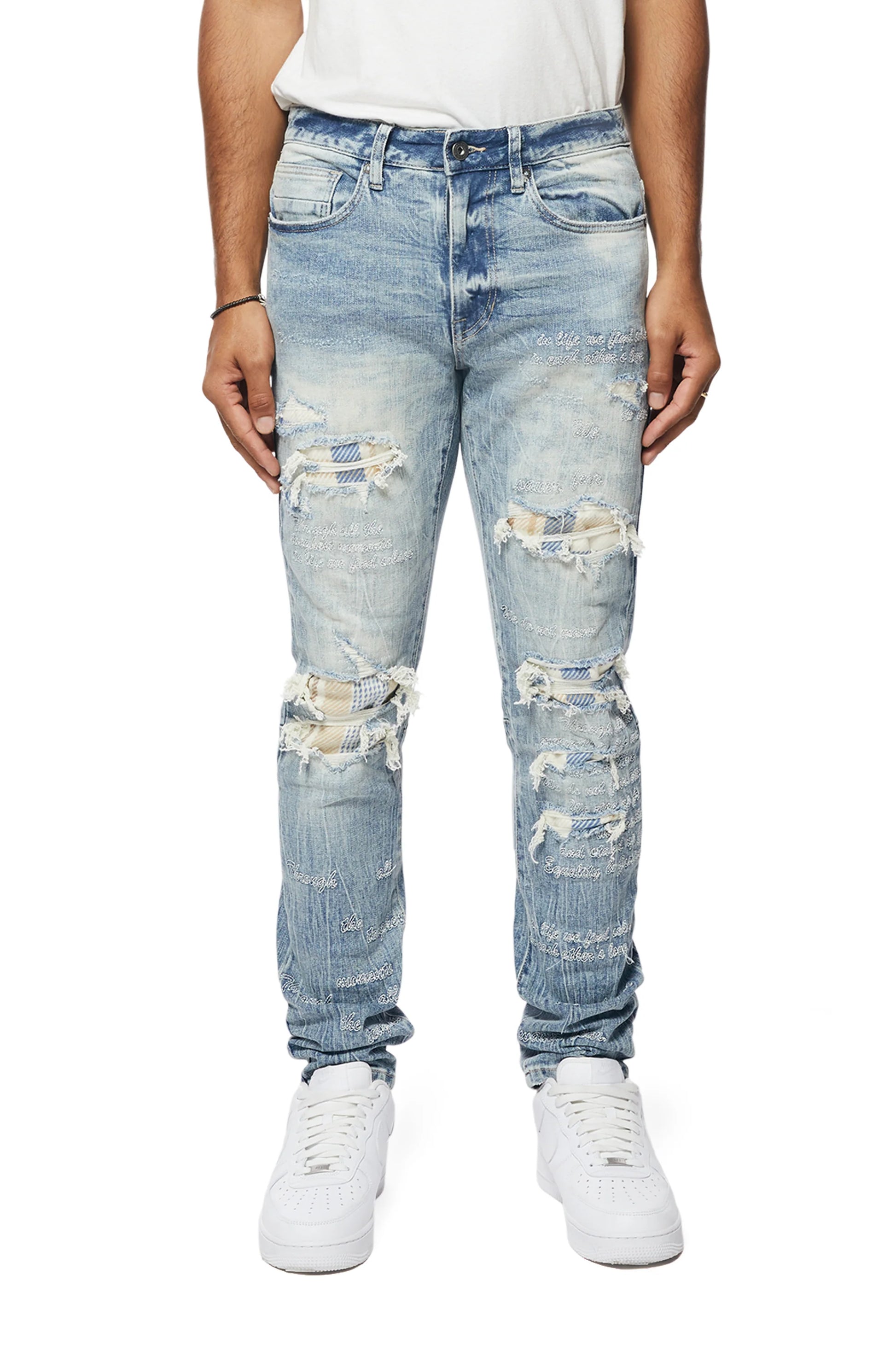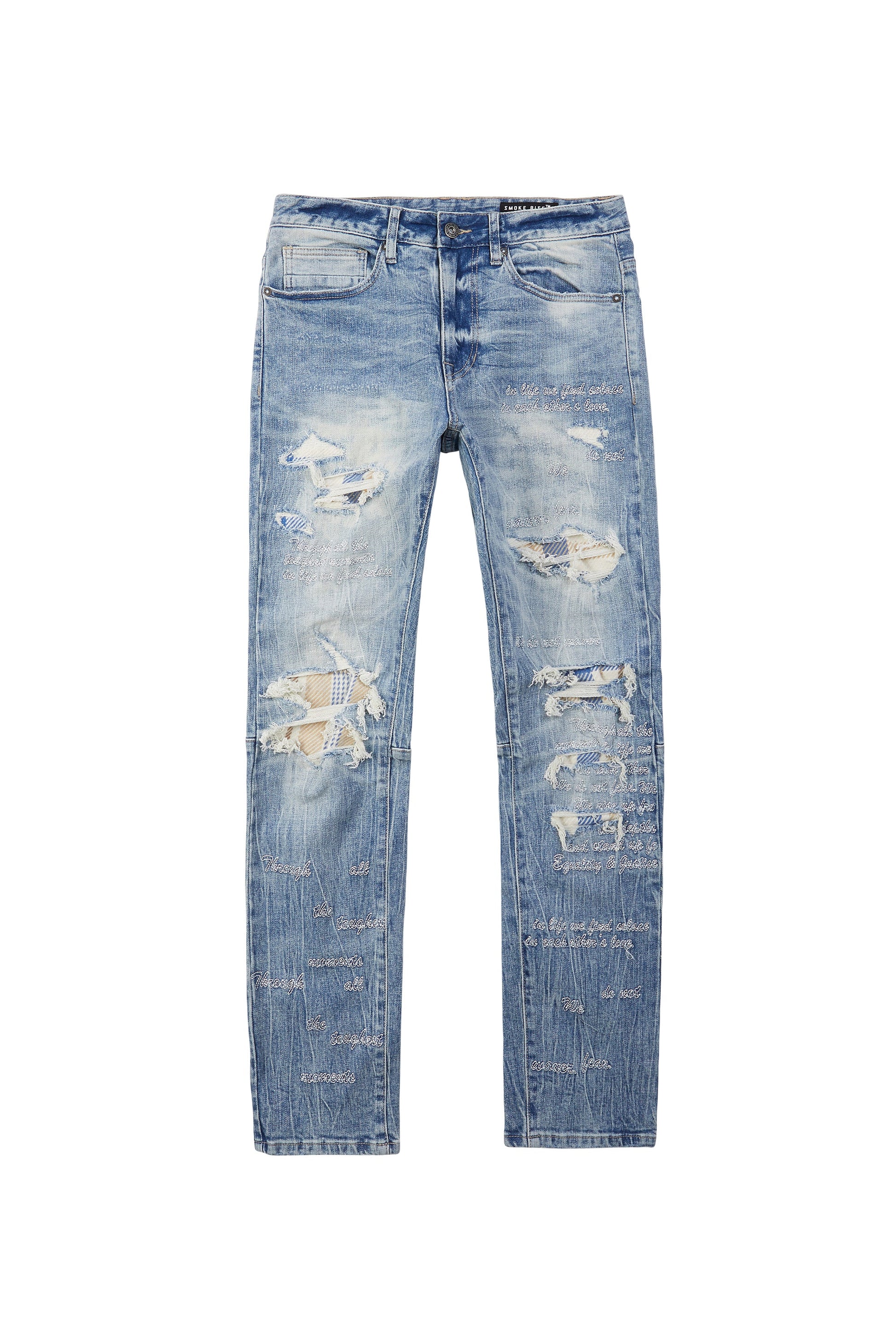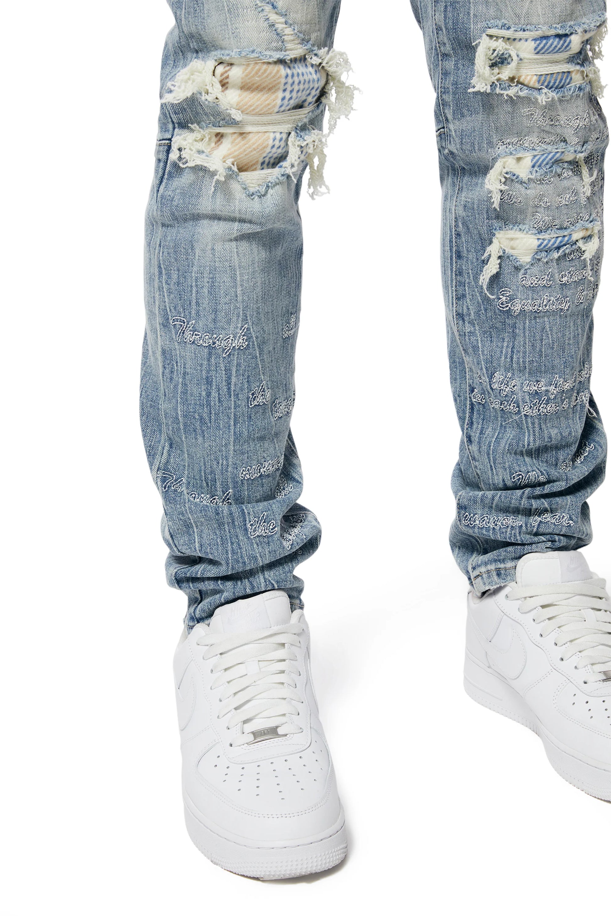 Embroidered Plaid Backed Denim Jeans - Lowell Blue-jP23619
