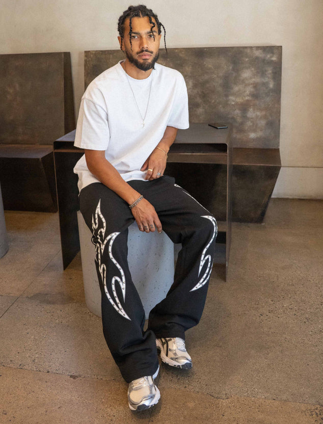 The Stud Tribal Pants are crafted from soft French terry and feature bold tribal graphics embellished with metal studs.