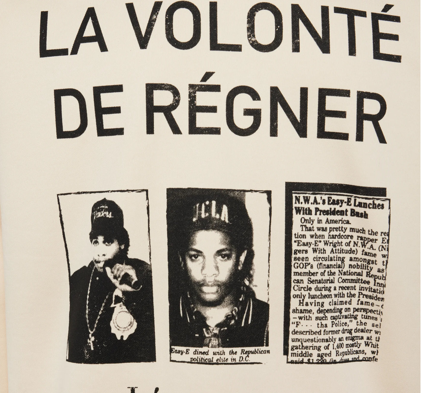 100% cotton hoodie with a raw hem finish in cream. Statement reads "La Volante De Régner"--"L'artiste de Compton mange avec l'élite, which translates to "The Will to Rule" -- "Compton entertainer eats with the elite". Graphic depicts the newspaper article from the dinner that Easy-E Wright attended on March 18th 1991, hosted by a group called The Republicans Inner Circle under President George H.W.Bush.