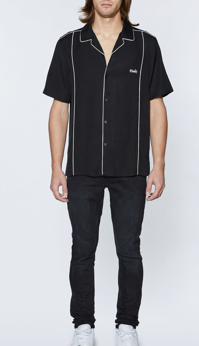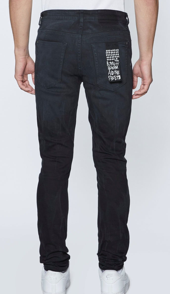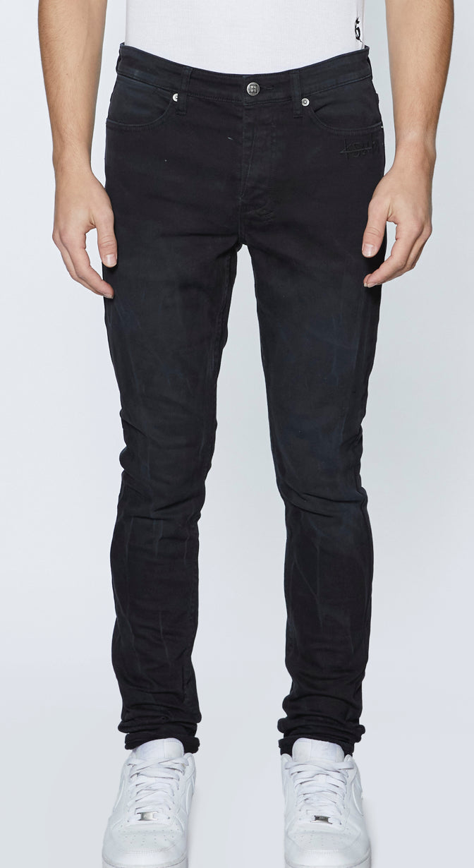 A mid rise five pocket full length skinny jean. Made from a premium comfort black stretch denim. Constructed with unique angled belt loops and front fly seam detail and colour fade treatments. Features Ksubi's 1999 logo tonally embroidered on the front. Finished with t-box and 4x4 embroidery ghost patching detailing and Ksubi branded hardware.