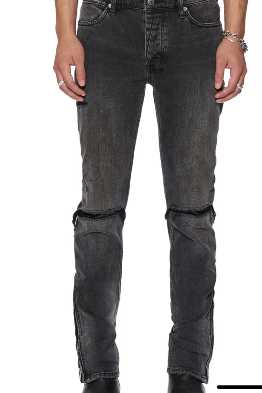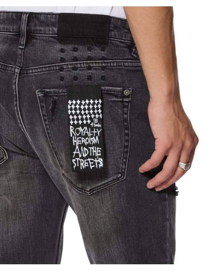 The Van Winkle Torqued Chamber Black is a mid rise five pocket full length skinny jean. Made from premium comfort stretch black denim with a medium stone wash, it is constructed with unique angled belt loops, front fly seam detail, and aging treatments. Features include a side seam zipper gusset cut from a faux leather insert, deconstruction repaired with faux leather inserts. Finished with T-box and 4x4 embroidery, ghost patching detailing, and Ksubi branded hardware.