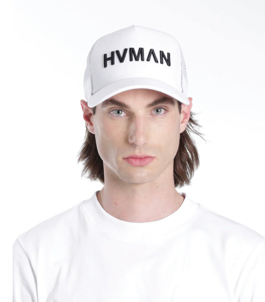 White mesh trucker cap crafted from durable wool acrylic fabric with a black raised embroidery logo on the front.
