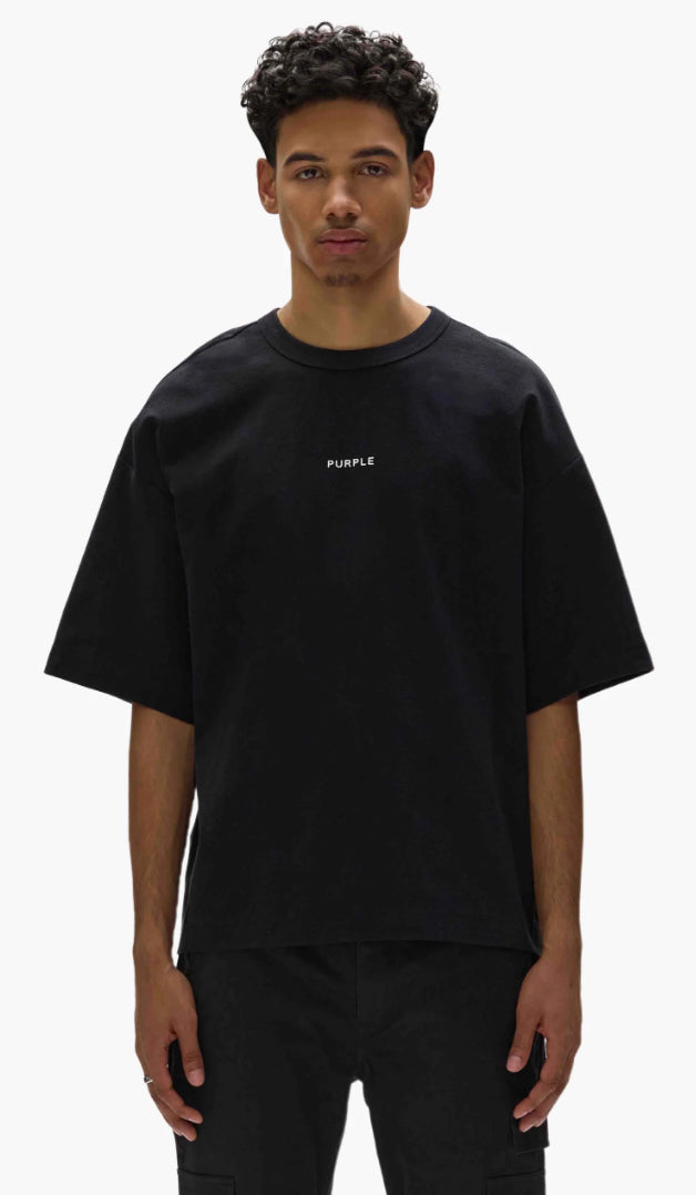 This short-sleeved top is a premium black jersey knit. Featuring Purple Brand logo lettering in front and an arched gothic logo across the shoulders.