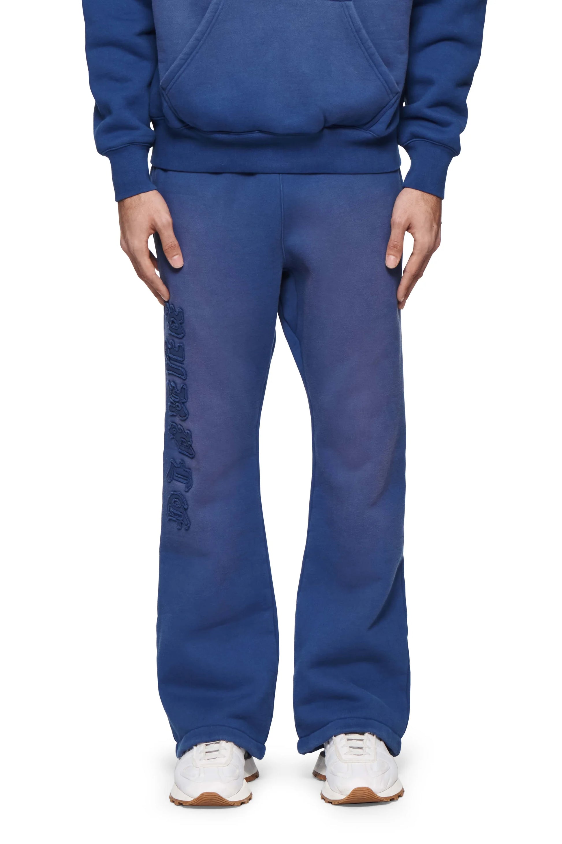 Defined by a flared silhouette, this sweatpant comes in heavyweight blue fleece with a brushed-back surface. The pair features gothic vertical Purple Brand logo lettering and an elastic pull-on waist with drawcords for elevated comfort and an enhanced fit.