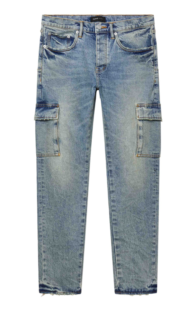 Our P001 is a low-rise skinny men’s jean, crafted from premium stretch denim with classic five-pocket construction that includes a button-fly closure and reinforced belt loops as well as hidden rivets and an inner lining on the back pockets for durability. It’s fitted through the thigh to the ankle for a classic skinny taper, and comes in a light indigo wash with hand-abrading and cargo flap pockets. A custom Purple cowhide leather patch, a back pocket flasher and a logo hangtag lend signature branded finishes.