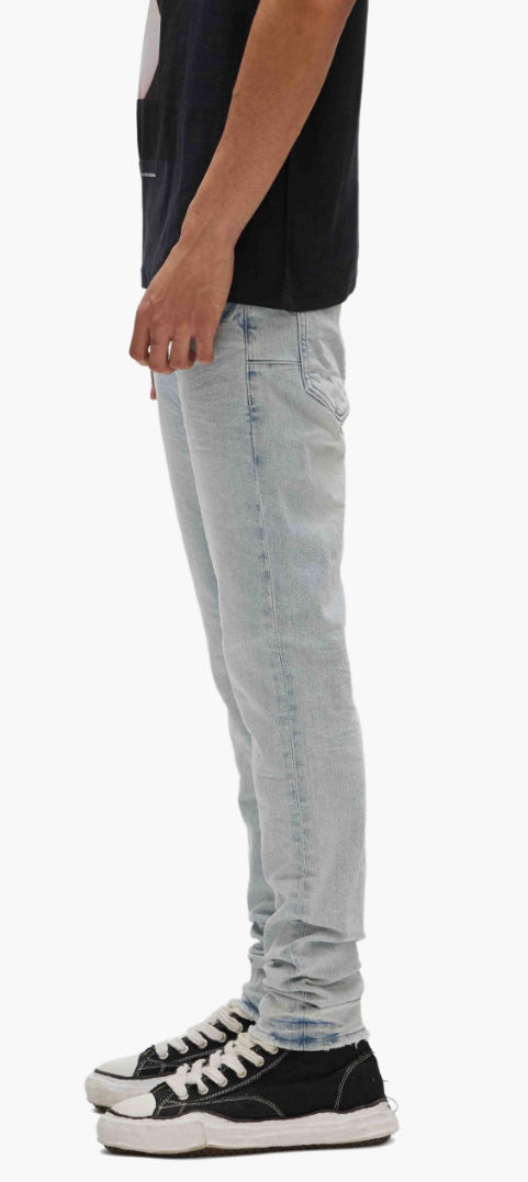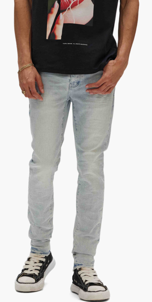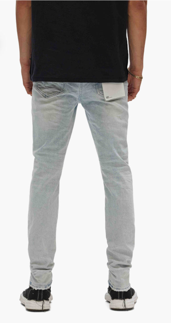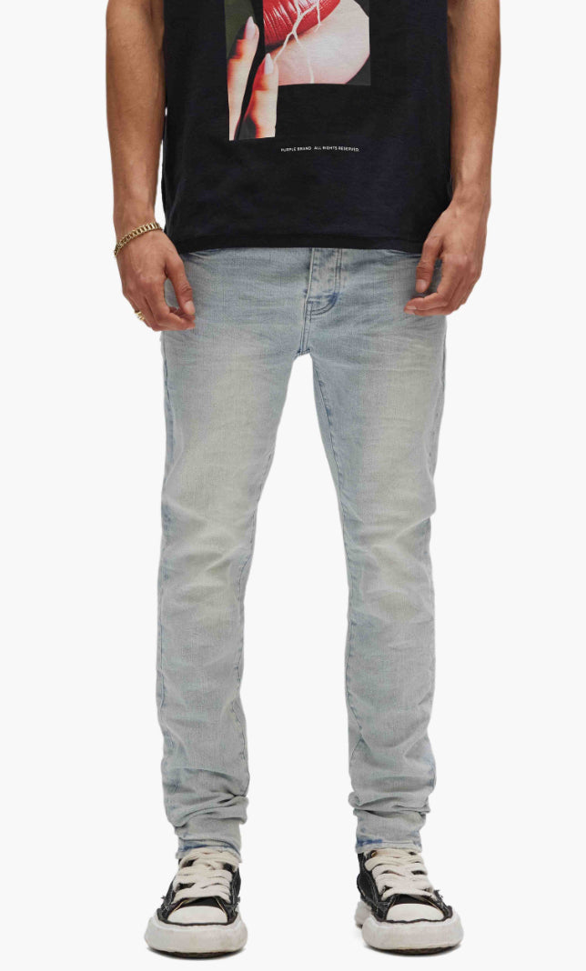Our P001 is a low-rise skinny men’s jean, crafted from premium stretch denim with classic five-pocket construction that includes a button-fly closure and reinforced belt loops as well as hidden rivets and an inner lining on the back pockets for durability. It’s fitted through the thigh to the ankle in a classic taper, and comes in a light indigo wash, tinted and faded by hand for a vintage look. A custom Purple cowhide leather patch, a back pocket flasher and a logo hangtag lend signature branded finishes.