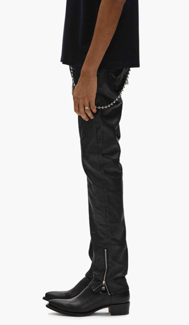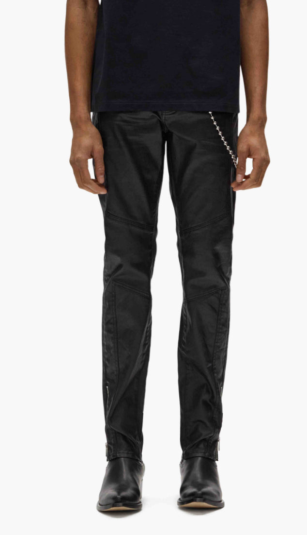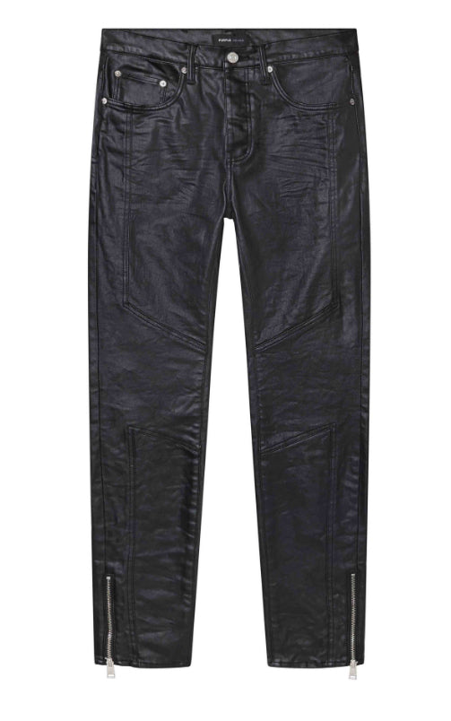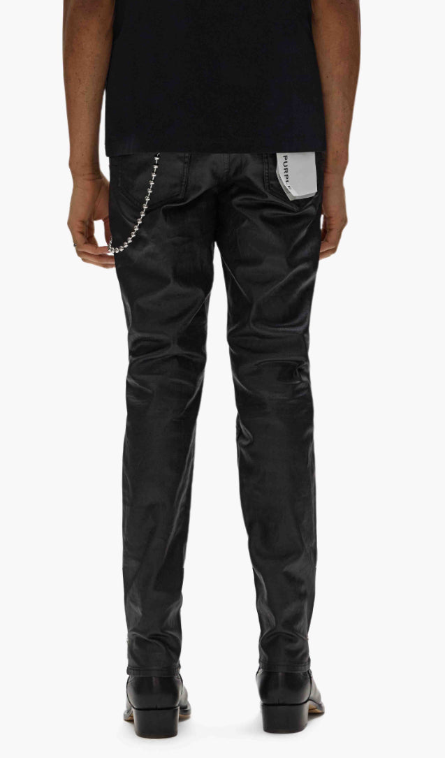 Our P001 is a low-rise skinny men’s jean, crafted from premium black stretch denim with classic five-pocket construction that includes a button-fly closure and reinforced belt loops as well as hidden rivets and an inner lining on the back pockets for durability. It’s fitted through the thigh to the ankle for a classic skinny taper, and shines with a glossy allover film coating. A custom Purple cowhide leather patch, a back pocket flasher and a logo hangtag lend signature branded finishes.