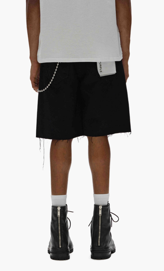 Crafted from premium black cotton denim, these P059 cutoff shorts are designed for a relaxed fit with classic five-pocket construction that includes a button-fly closure and reinforced belt loops as well as hidden rivets and an inner lining on the back pockets for durability. A custom Purple cowhide leather patch, a back pocket flasher and a logo hangtag lend signature branded finishes.
