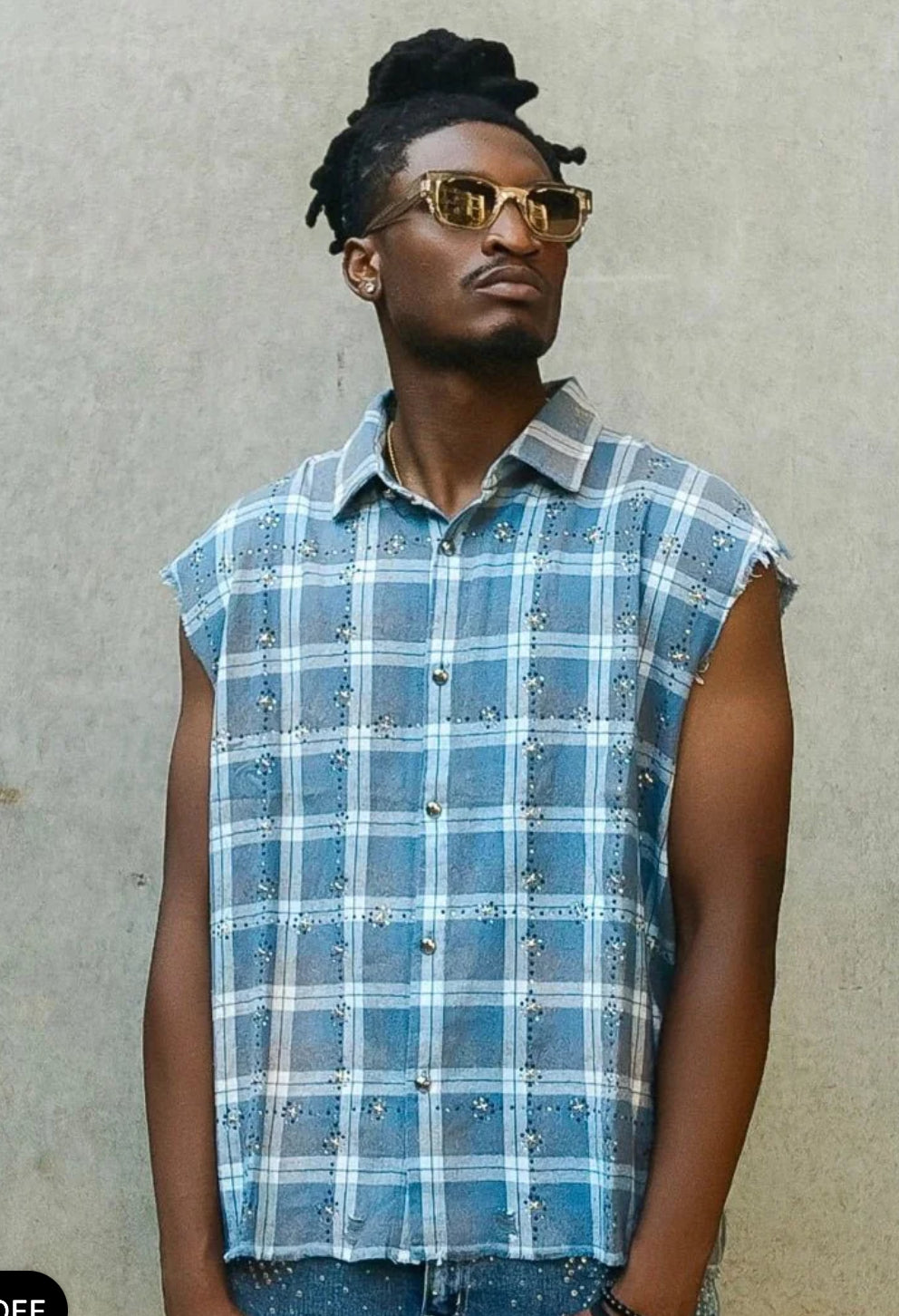 Custom-cut sleeveless flannel in a washed blue plaid. Finished with raw edges, western snaps, and all-over hand-set rhinestones. Signature Paper Money pyramid formation on the back.