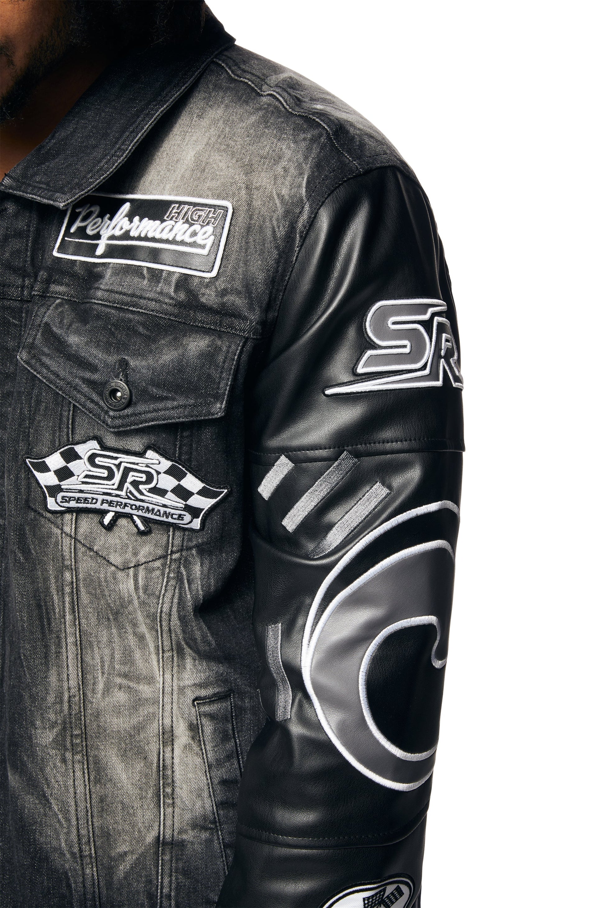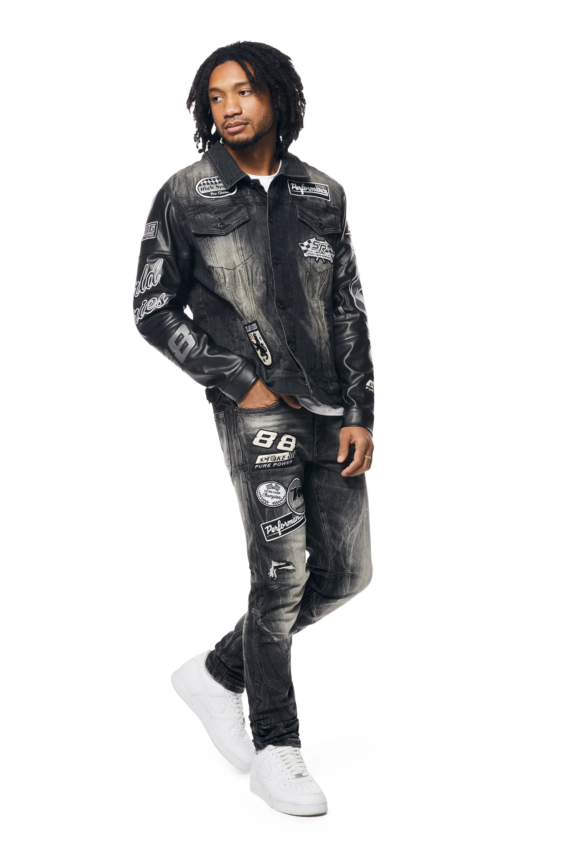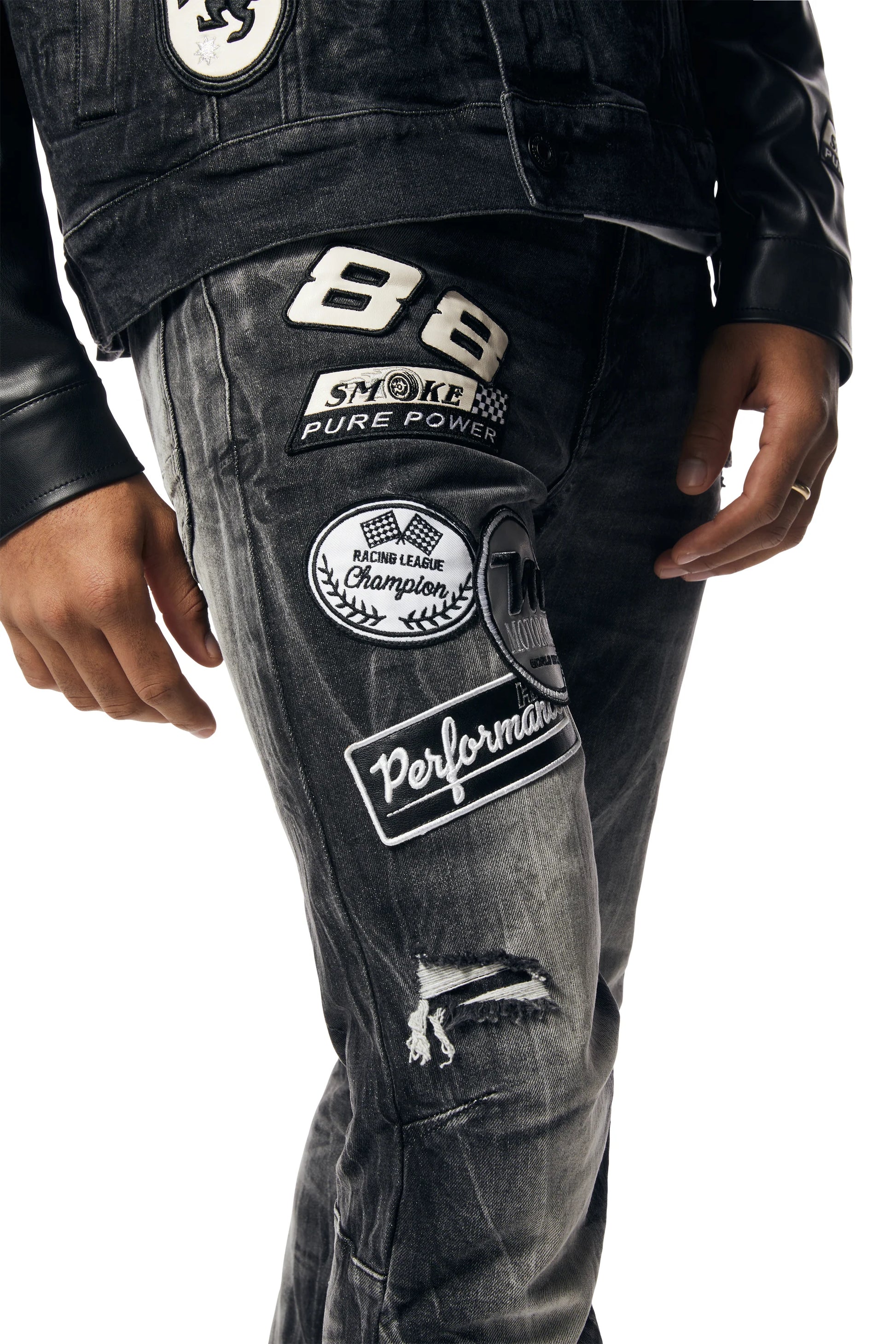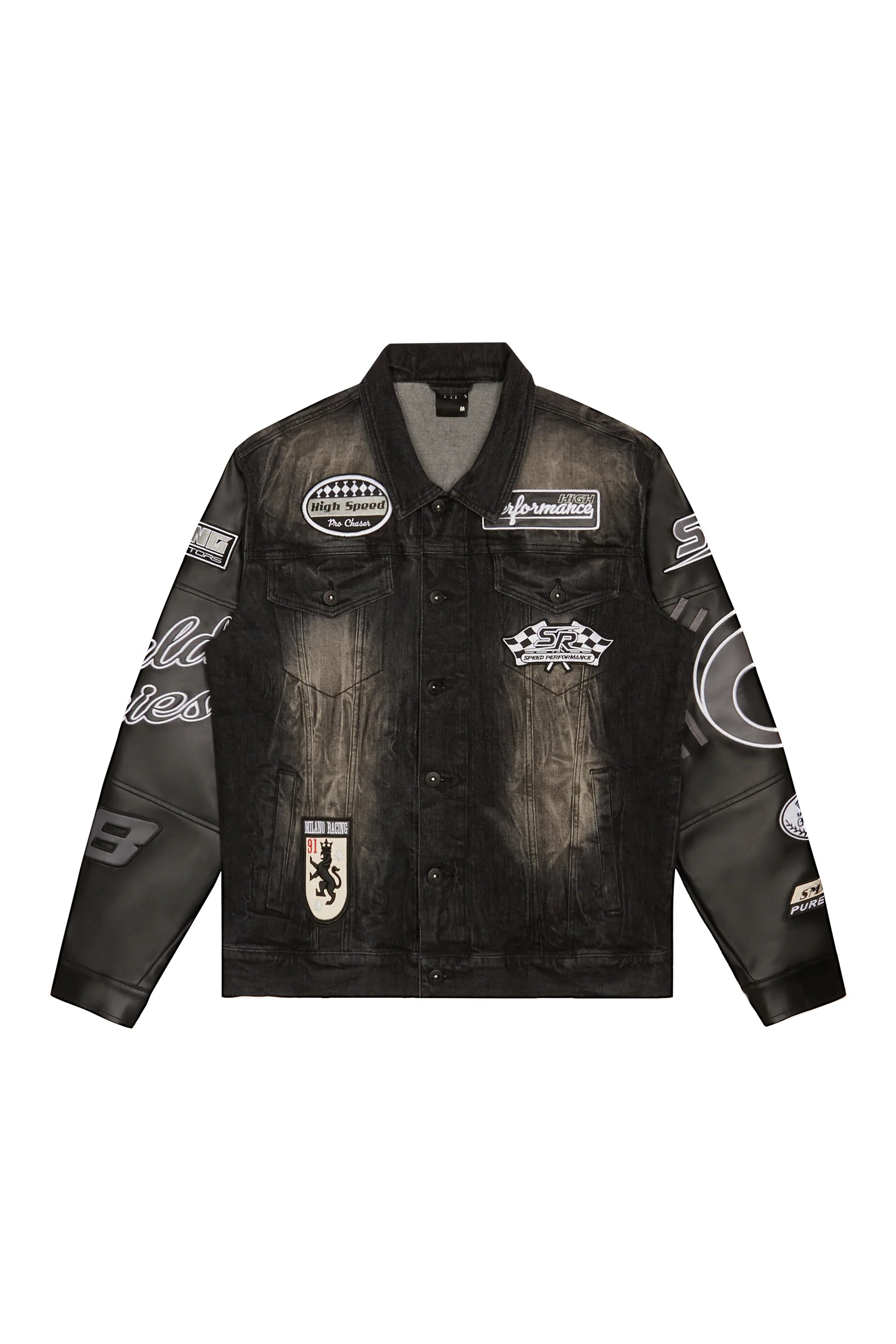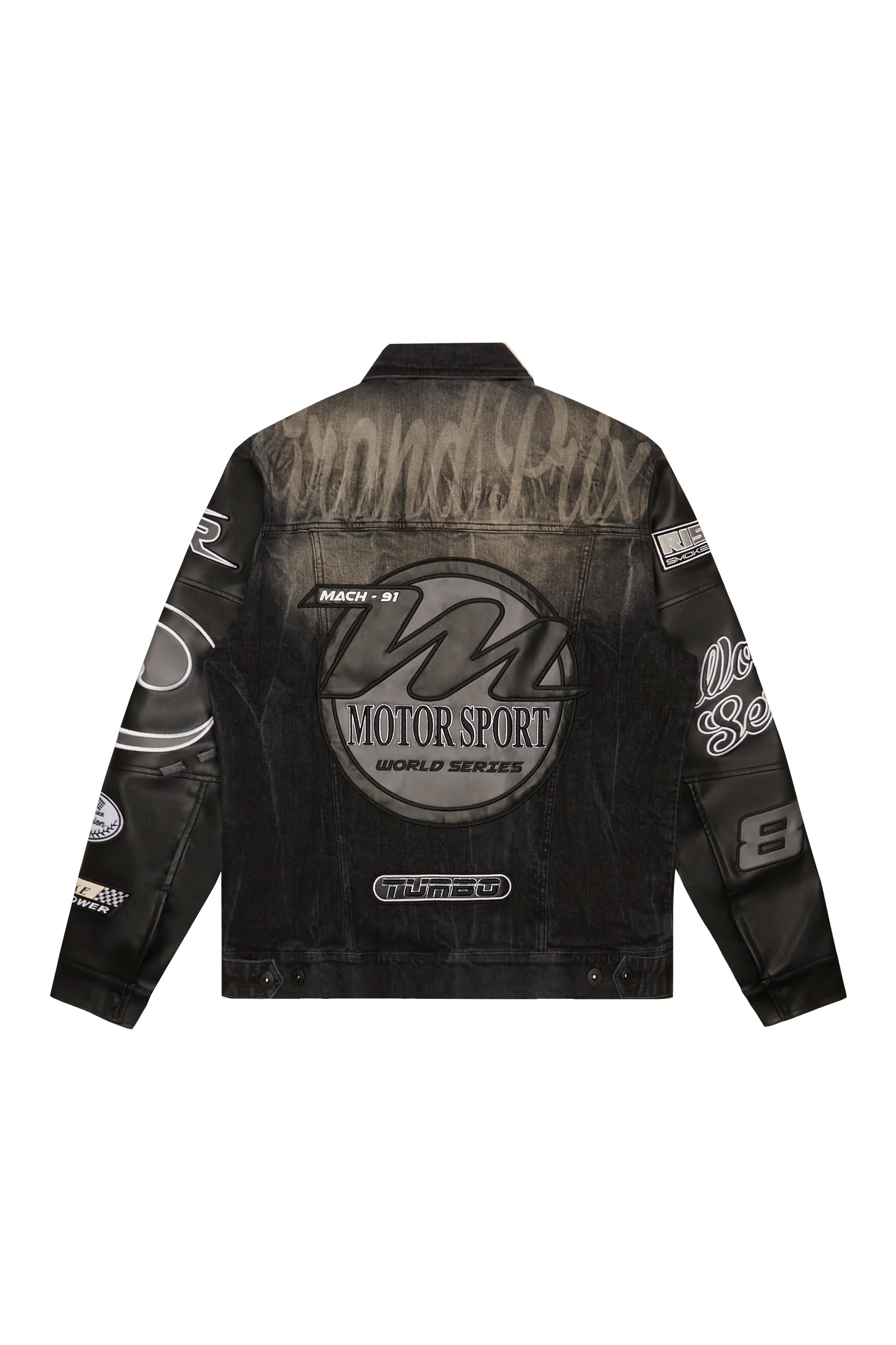 SMOKE RISE-Embroidered Patched Racing Denim Jacket - Moon Black-JJ24146
