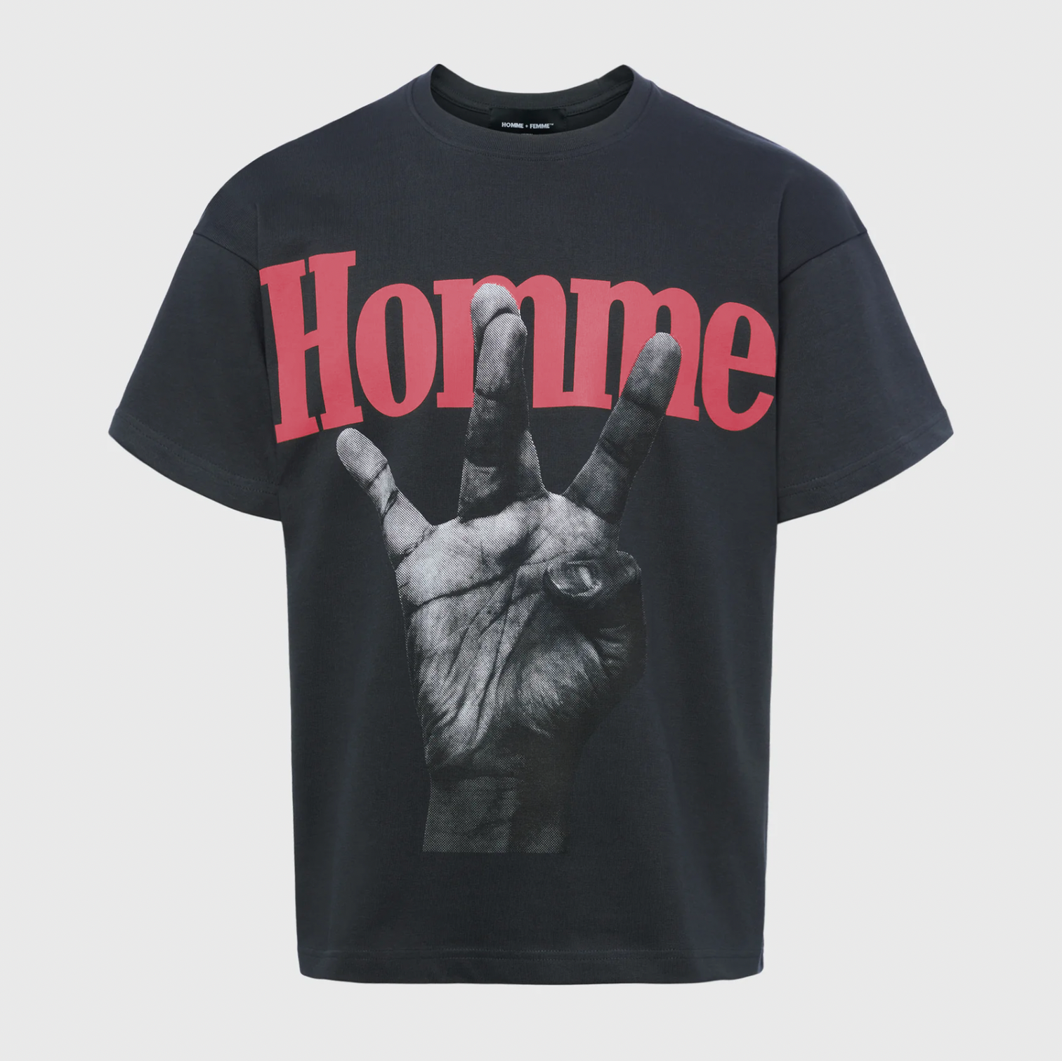 100% cotton t-shirt in black featuring front Homme in red and back Femme in forest green both with twisted fingers.