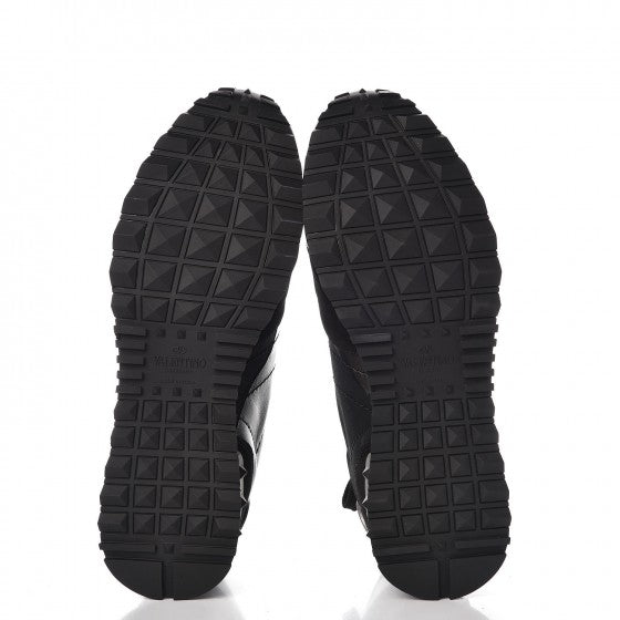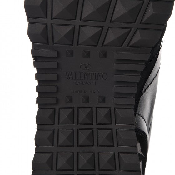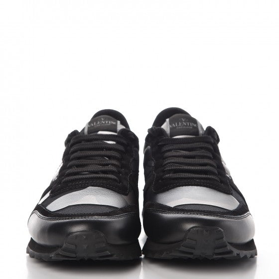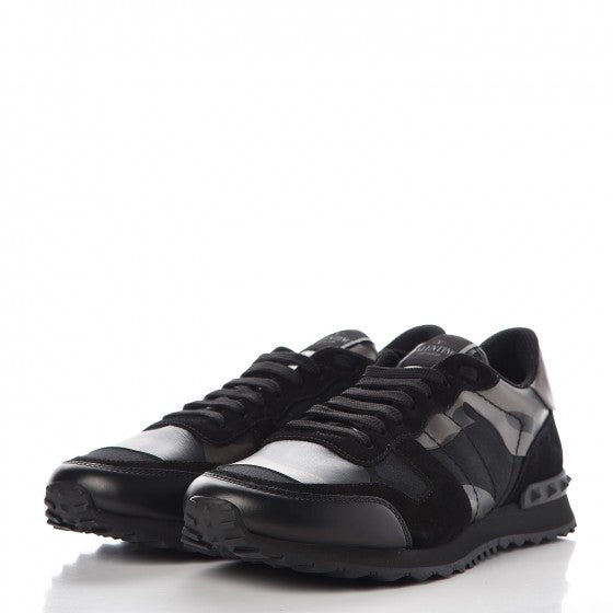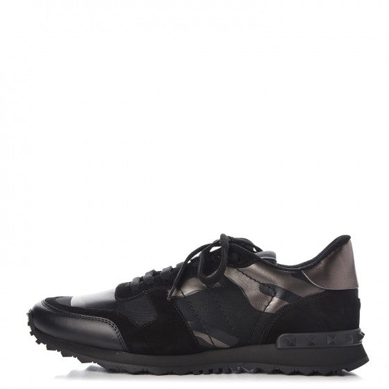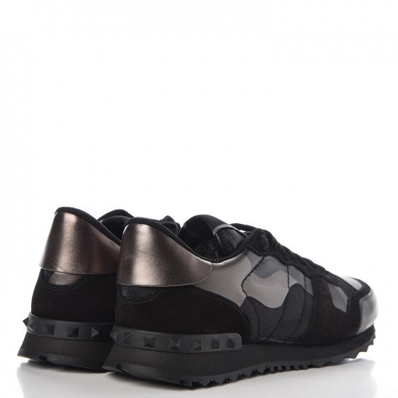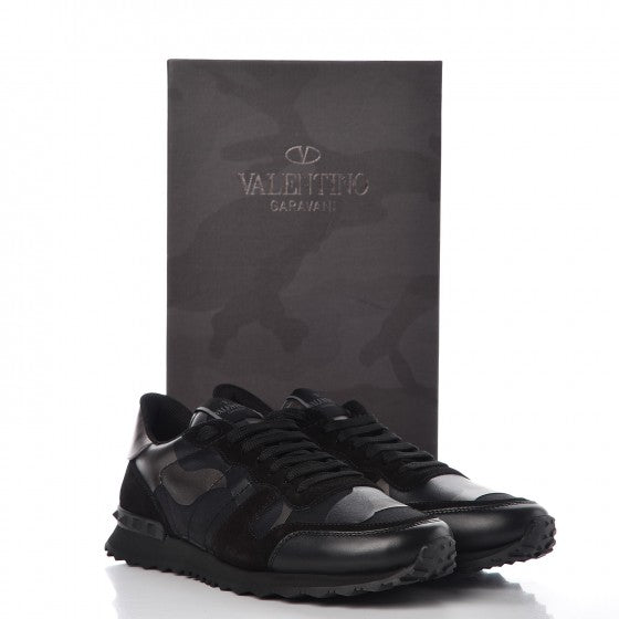 This is an authentic pair of VALENTINO GARAVANI Calfskin Suede Mens Camouflage Rockstud Sneakers in size 42 in Black. These chic sneakers are crafted of camouflage patterned canvas with metallic gold leather and black suede leather trim. Theses shoes have a black plastic stud lining around the back heel. Pair these shoes with jeans for day from Valentino!